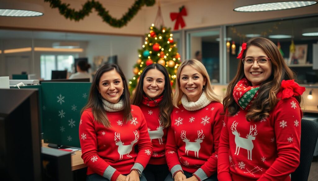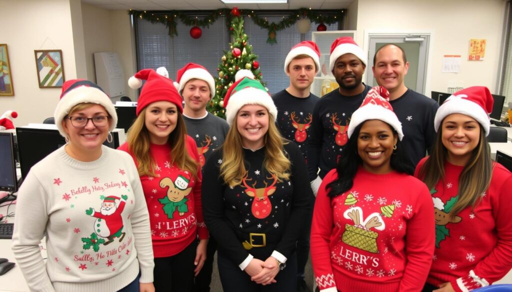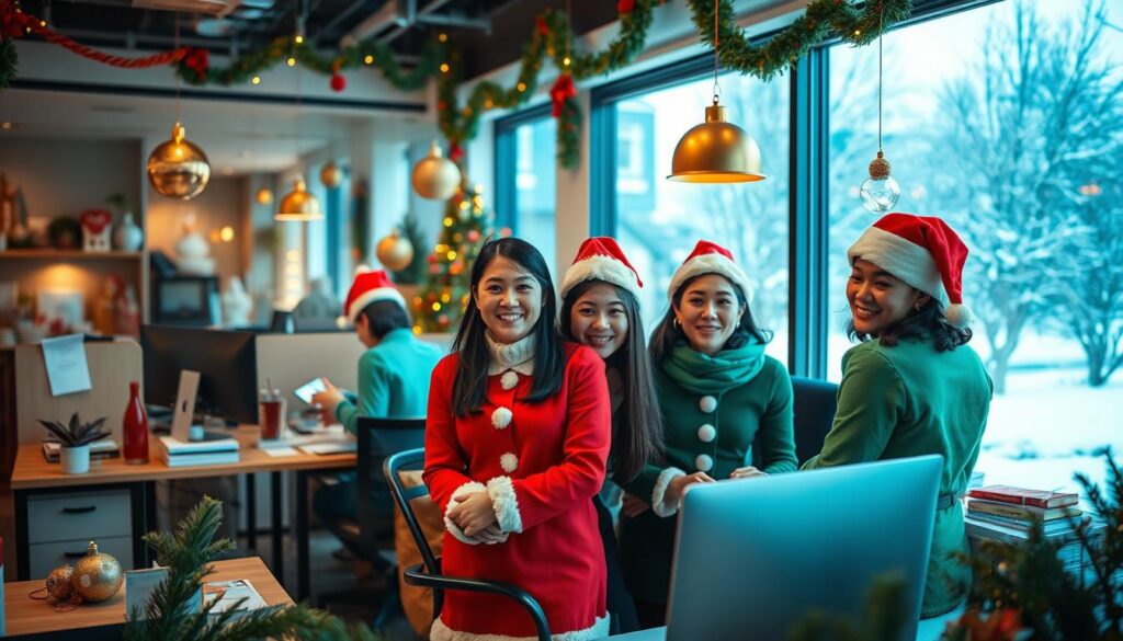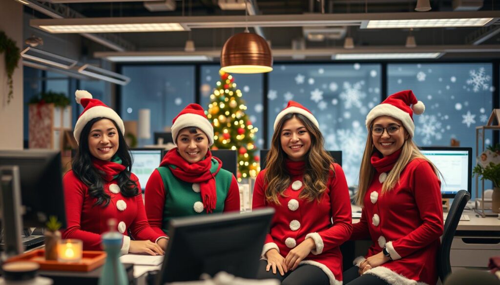 Trang trí văn phòng cho lễ Tết rất quan trọng. Đồng phục như áo len giáng sinh, nón noel, và áo khoác noel làm cho nơi làm việc trở nên vui vẻ. Nó giúp mọi người cảm thấy thoải mái hơn.