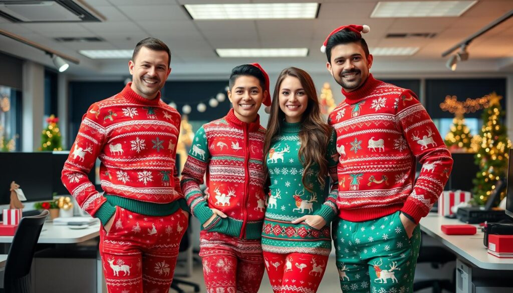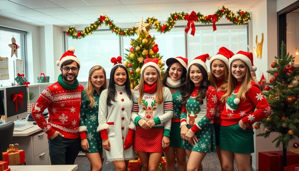 Tiệc giáng sinh công ty là dịp lý tưởng để mặc đồng phục noel. Nó tạo không khí lễ hội sôi động.